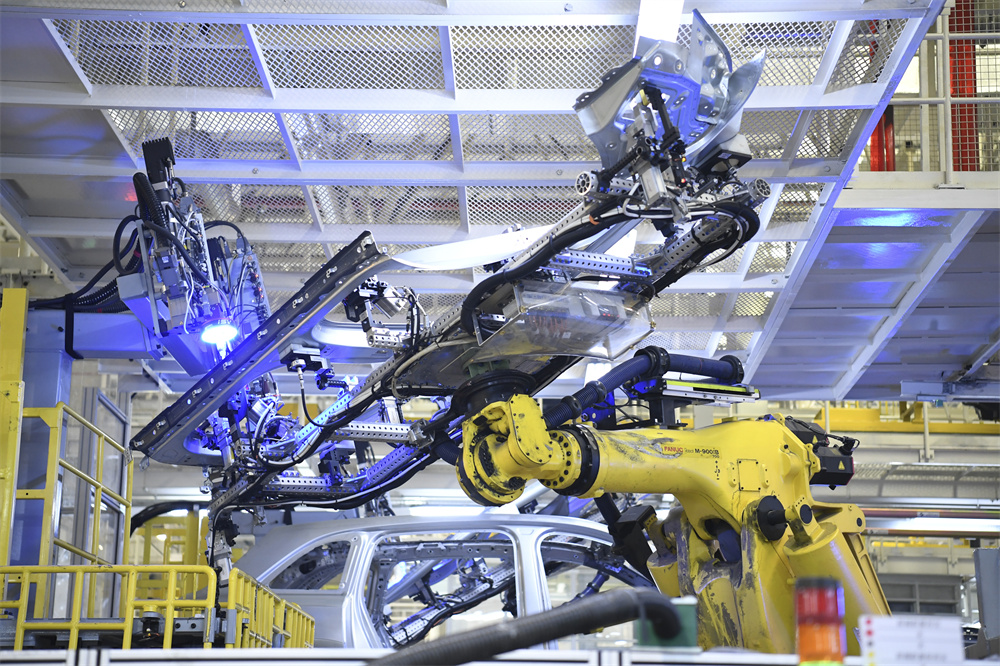 江苏常州理想汽车智能制造基地焊装车间的机械臂正在作业(5月31日摄)。新华社记者 柳文惠 摄