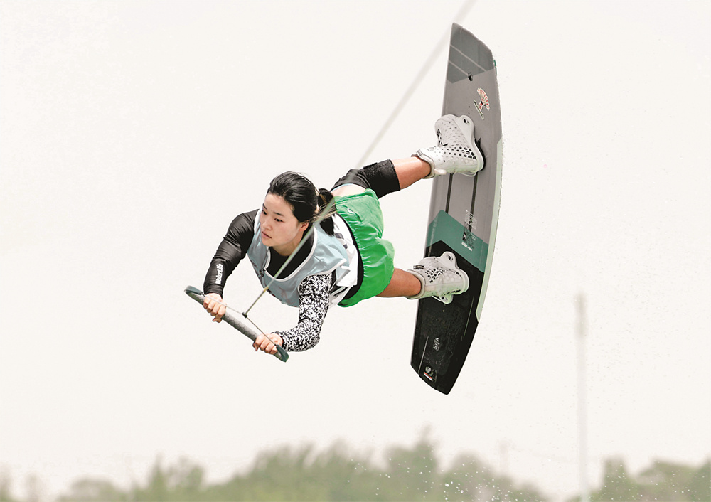 6月23日,中国选手徐露在尾波滑水女子公开组比赛中。最终,她以52.11分的成绩夺得冠军。当日,为期3天的2024亚洲尾波滑水系列赛石家庄站的比赛在河北省元氏县蟠龙湖闭幕。