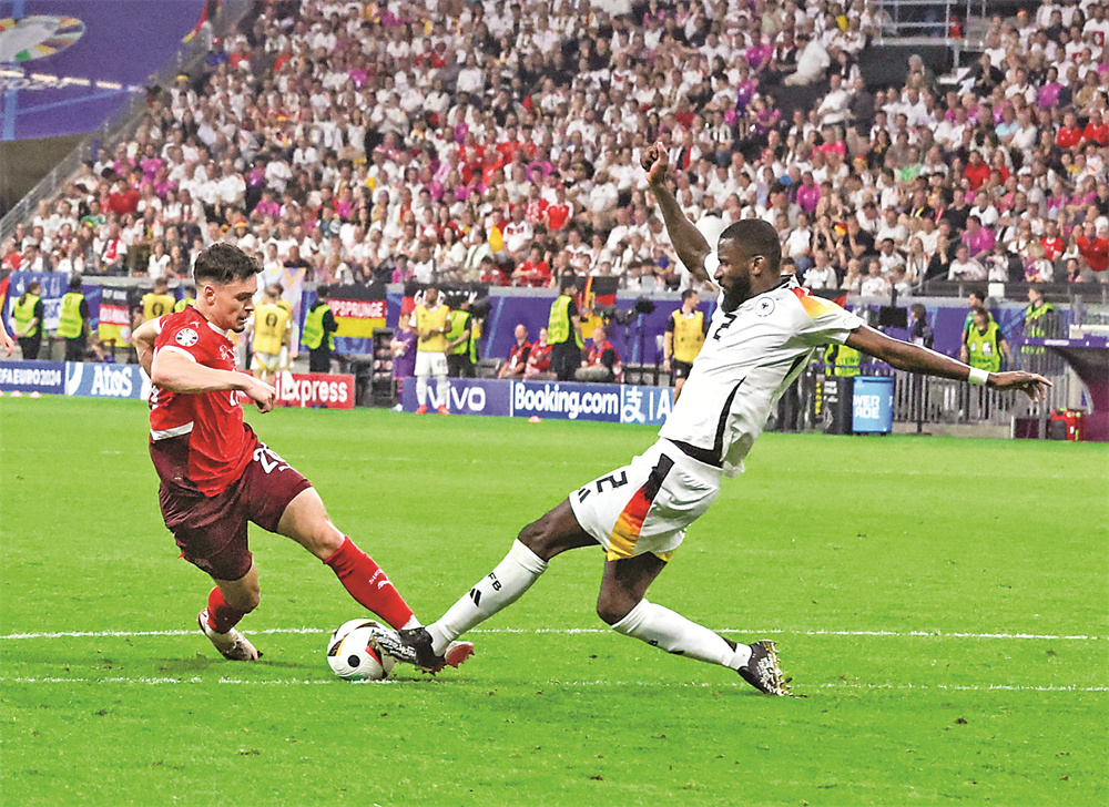 6月23日,德国队球员吕迪格(右)与瑞士队球员里德拼抢。