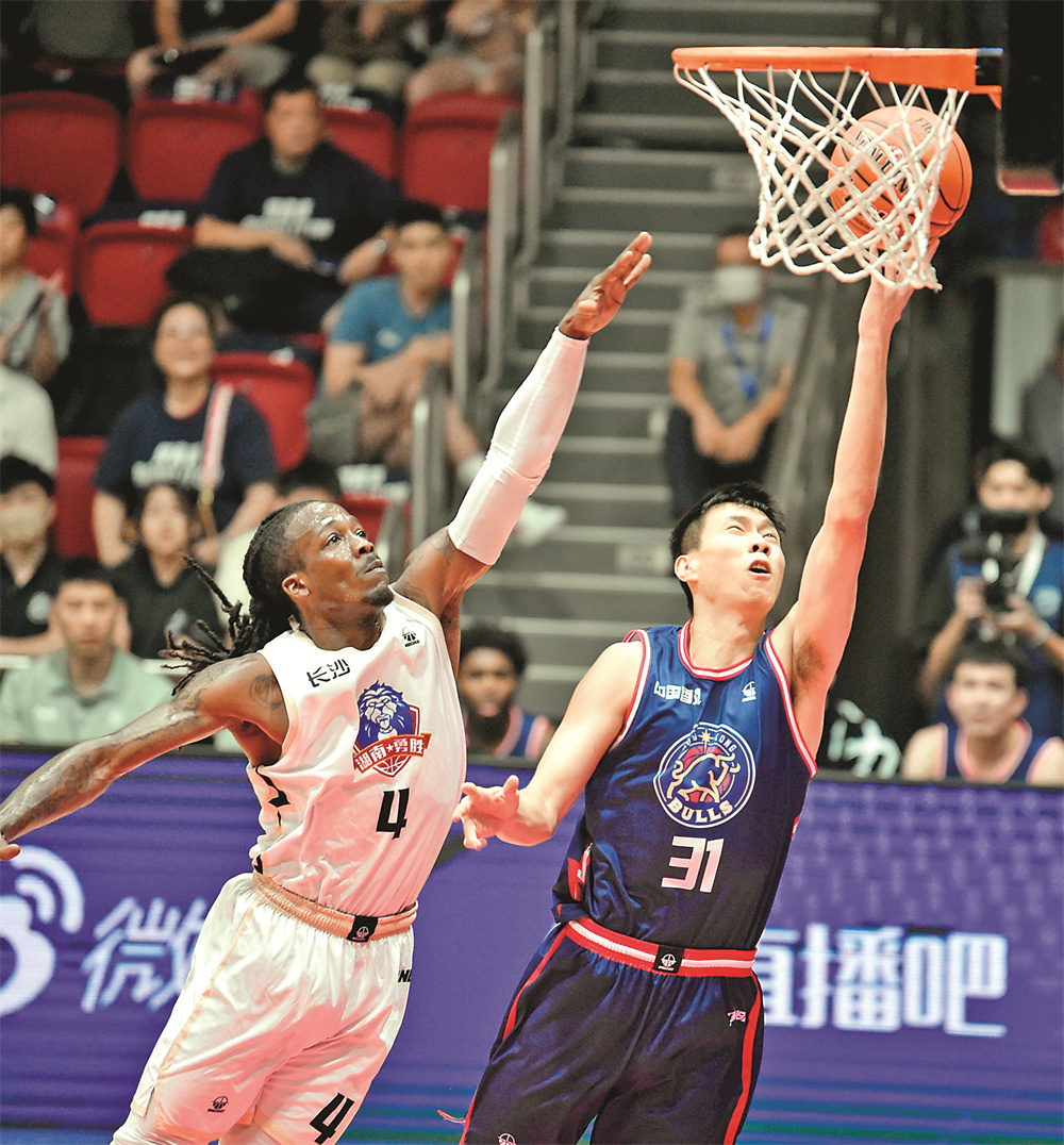 6月23日,长沙湾田勇胜队球员考特尼·格兰特·福特森(左)防守香港金牛队球员孙晨然上篮。当日,在香港举行的全国男子篮球联赛(NBL)中,香港金牛队91比87战胜湖南长沙湾田勇胜队。