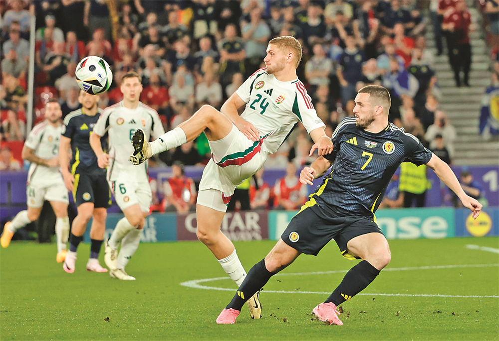 6月23日,匈牙利队球员达尔道伊(右二)和苏格兰队球员麦金(右一)在比赛中拼抢。当日,在德国斯图加特进行的2024年欧洲足球锦标赛小组赛A组第三轮比赛中,匈牙利队1比0战胜苏格兰队。 新华社发(菲利普·鲁伊兹 摄)