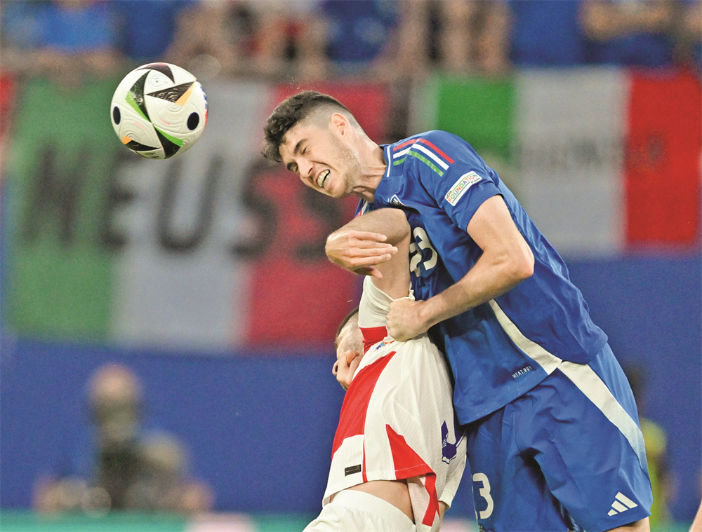 6月24日,意大利队球员巴斯托尼(上)在比赛中争顶。当日,在德国莱比锡举行的2024欧洲足球锦标赛B组第三轮比赛中,克罗地亚1比1战平意大利。 新华社记者 任鹏飞 摄