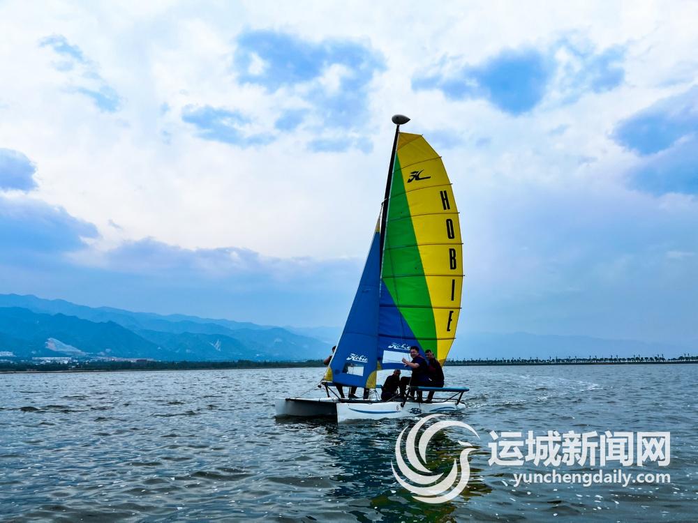 在关公国际滑翔伞营地,一架架五彩斑斓的滑翔伞驰骋蓝天,将盐湖、关帝圣像尽收眼底,让参与者拥有独特的视角和刺激的体验;七彩盐湖中,一叶叶色彩绚丽的帆船破风逐浪,纵横于碧波之上……