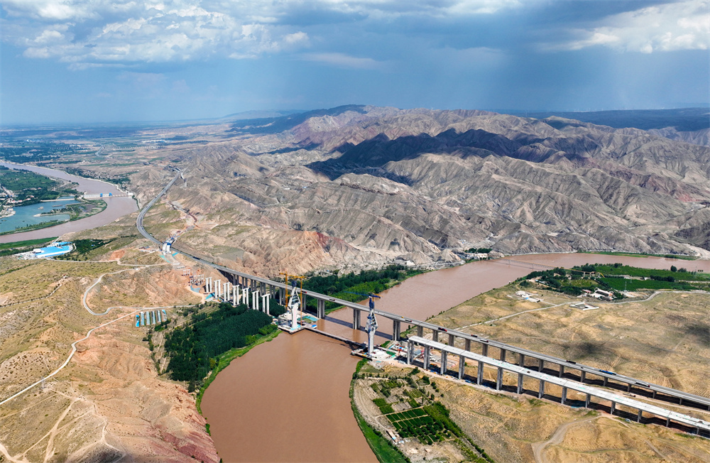 6月26日拍摄的沙坡头黄河公路大桥施工现场(无人机照片)。