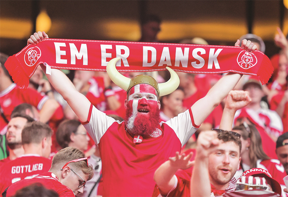 6月25日,丹麦队球迷在比赛前为球队助威。
