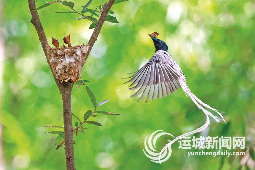 近日在平陆县黄河湿地三湾大天鹅生态保护园拍摄的寿带鸟育雏画面。