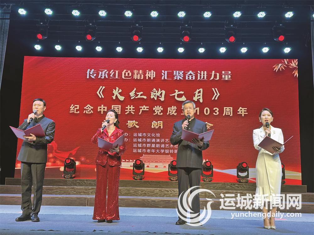“以青春之我,创建青春之家庭、青春之国家、青春之民族……”6月28日下午,在中国共产党成立103周年即将到来之际,由运城市文化馆主办,运城市朗诵演讲艺术协会、运城市群星朗诵艺术社、运城市老年大学银铃朗诵艺术社承办的“传承红色精神 汇聚奋进力量”《火红的七月》诗歌朗诵会在市文化馆举行。近百名同志齐聚一堂,用诗歌抒发对党的热爱和崇高敬意,为党送上最真挚的生日贺礼。