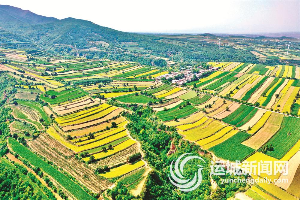 盛夏时节,从高空俯瞰夏县庙前镇中条山上的层层梯田,或绿意盎然,或金光灿灿,恰似一幅秀美的丰收画卷(摄于6月29日)。 特约摄影 郝 健 摄