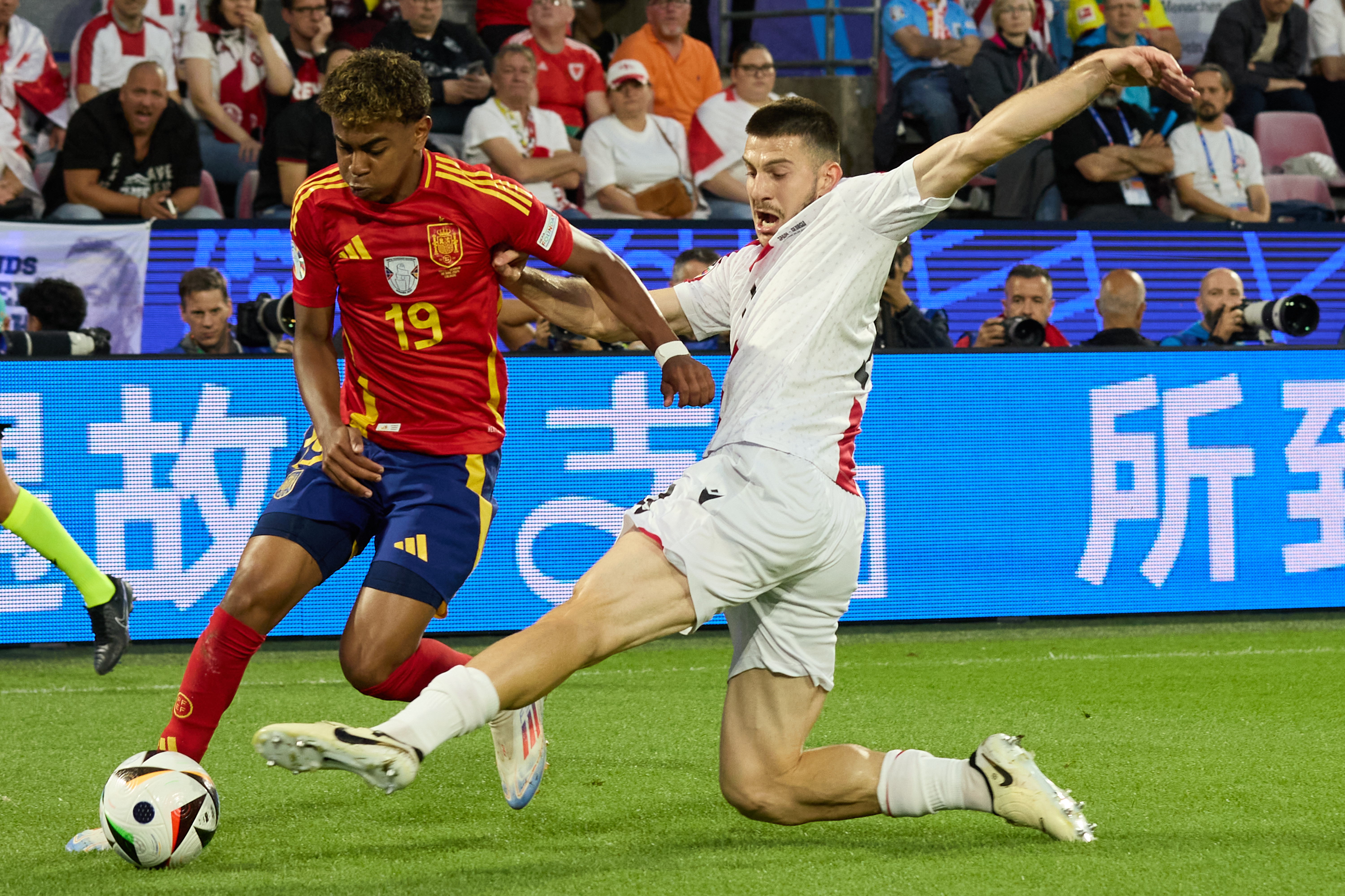 6月30日,西班牙队球员拉明·亚马尔(左)与格鲁吉亚队球员卢卡·洛乔什维利在比赛中拼抢。当日,在德国科隆进行的2024欧洲足球锦标赛八分之一决赛中,西班牙队4比1战胜格鲁吉亚队,晋级八强。