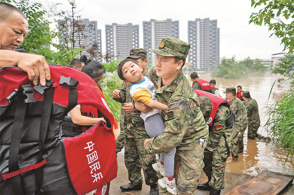 7月1日,在平江县天岳街道大西村,民兵在转移群众。