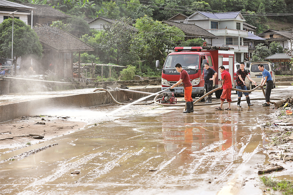 7月2日,在广西柳州市融安县板榄镇泗安村,乡镇专职消防员在冲洗路面。