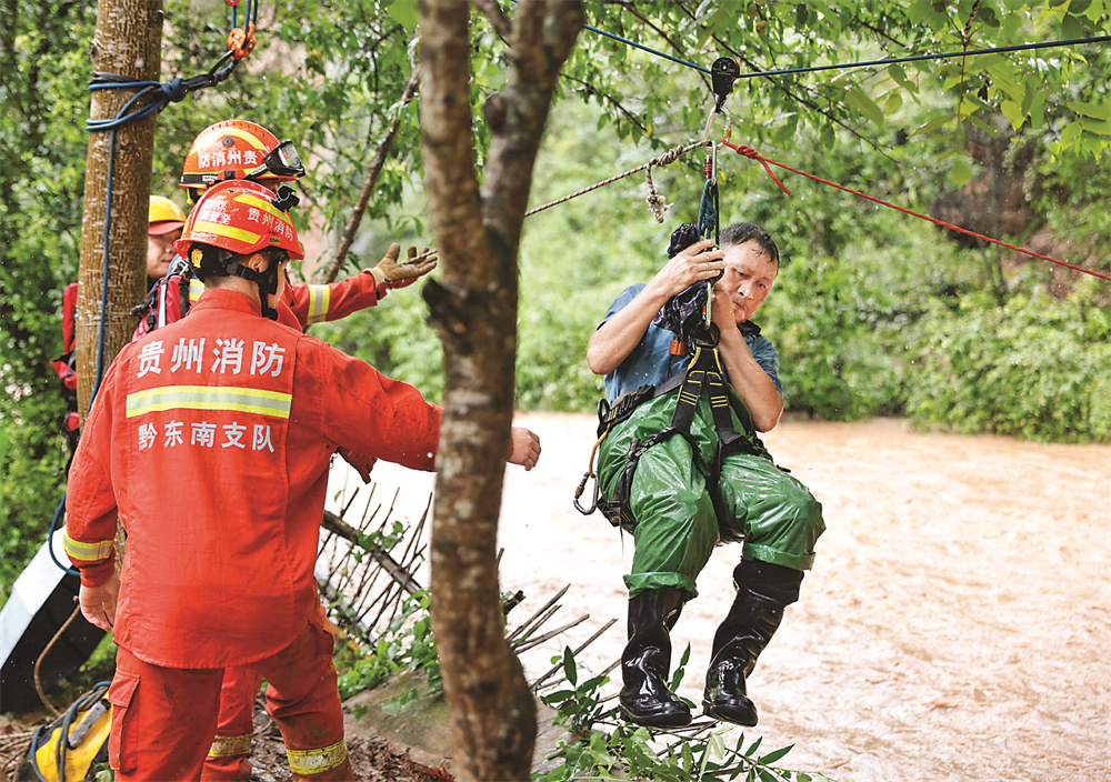 6月29日,在贵州省黔东南苗族侗族自治州施秉县城关镇伍旗村,消防员转移被困村民。