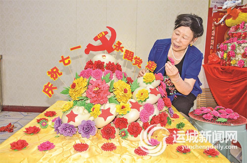 近日,省级非物质文化遗产项目万荣面塑传承人解云仙精心制作了面塑作品“庆祝‘七一’ 永跟党走”,以传承红色基因,庆祝中国共产党成立103周年。