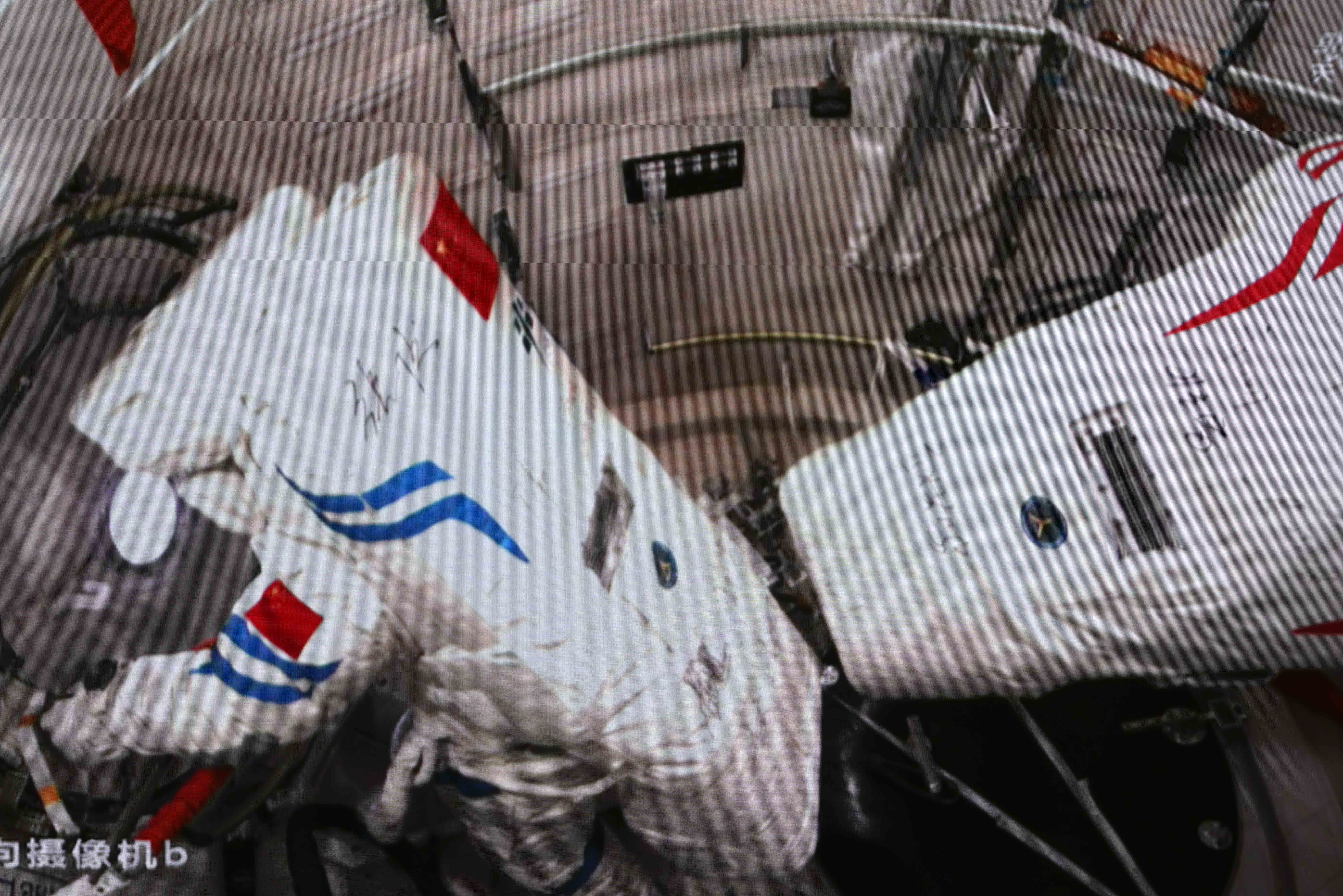 7月3日在北京航天飞行控制中心拍摄的神舟十八号航天员李聪在空间站组合体舱外作业的画面