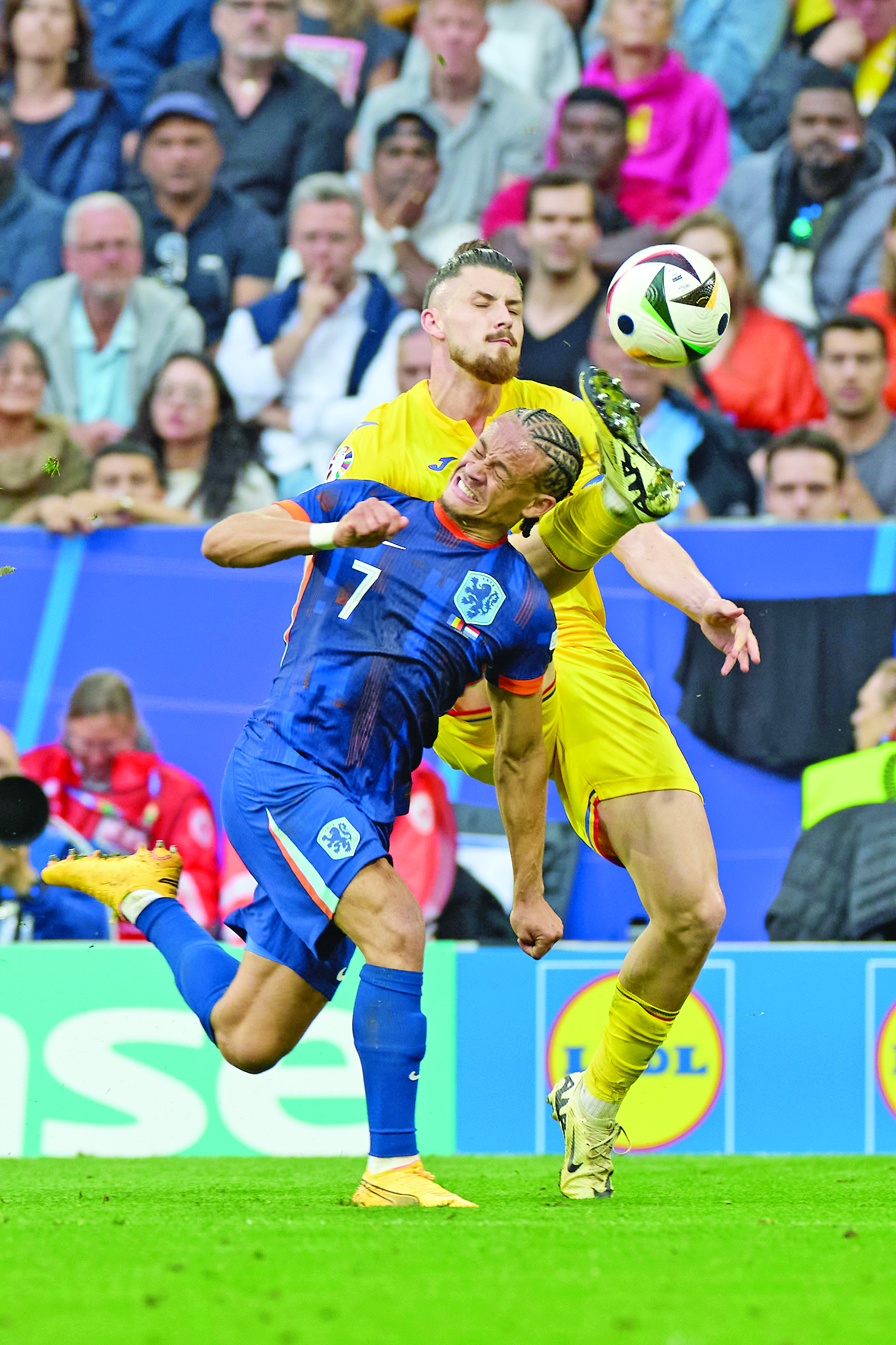 7月2日,在德国慕尼黑进行的2024欧洲足球锦标赛八分之一决赛中,荷兰队球员西蒙斯(前)与罗马尼亚队球员拉杜·德古拉辛在比赛中拼抢。 新华社记者 孟鼎博 摄