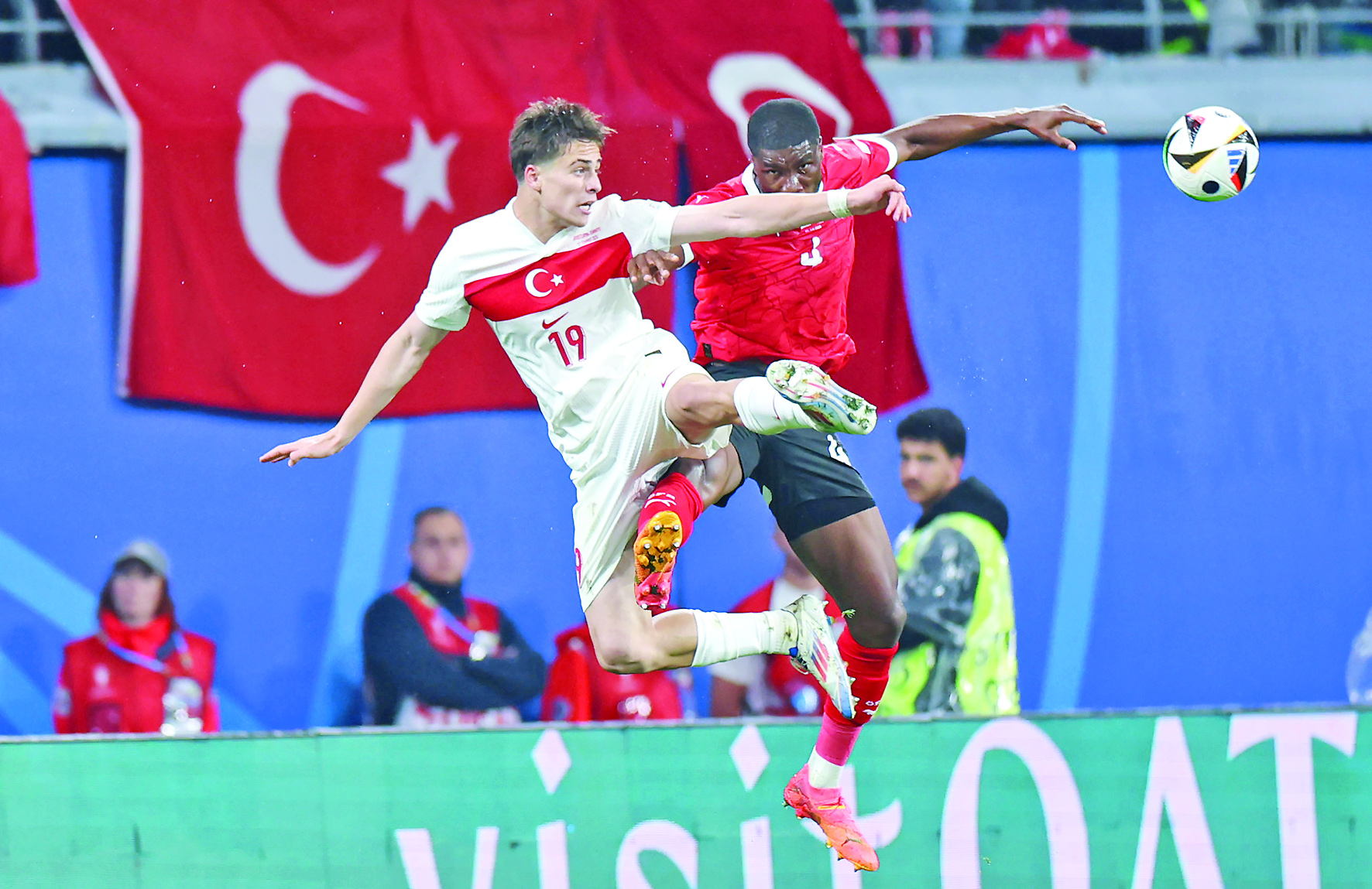 ▲7月2日,在德国莱比锡进行的2024欧洲足球锦标赛八分之一决赛中,土耳其队球员凯南·伊尔迪兹(左)与奥地利队球员凯文·丹索拼抢。 新华社记者 白雪飞 摄