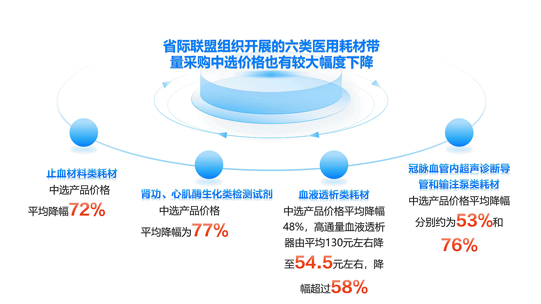 省际联盟组织开展的六类医用耗材带量采购中选价格也有较大幅度下降,降价结果将极大惠及广大患者。其中,止血材料类耗材,中选产品价格平均降幅72%;肾功、心肌酶生化类检测试剂,中选产品价格平均降幅为77%;血液透析类耗材,中选产品价格平均降幅48%,高通量血液透析器由平均130元左右降至54.5元左右,降幅超过58%;冠脉血管内超声诊断导管和输注泵类耗材,中选产品价格平均降幅分别约为53%和76%。