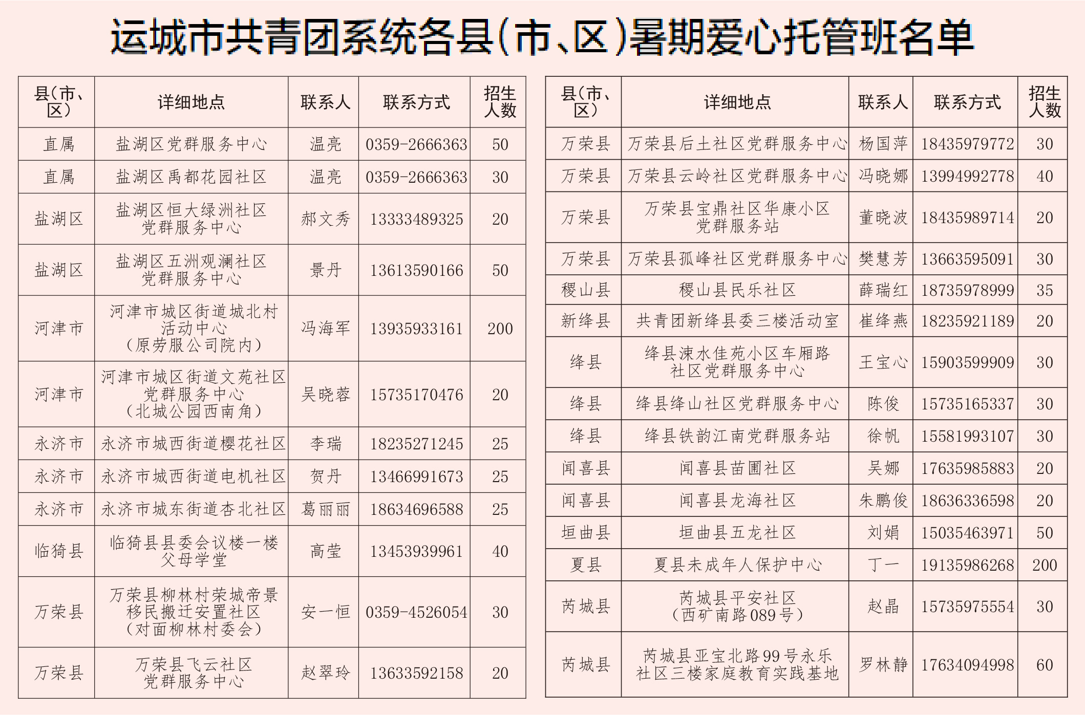 托管时间为7月8日至8月16日(工作日)。各个托管班每天的托管时间、招收人数也不尽相同。比如禹都花园社区托管时间为上午8:30至12:00,下午3:00至6:00,招收30人;盐湖区党群服务中心托管时间为上午9:00至12:00,下午3:00至5:30,招收50人。