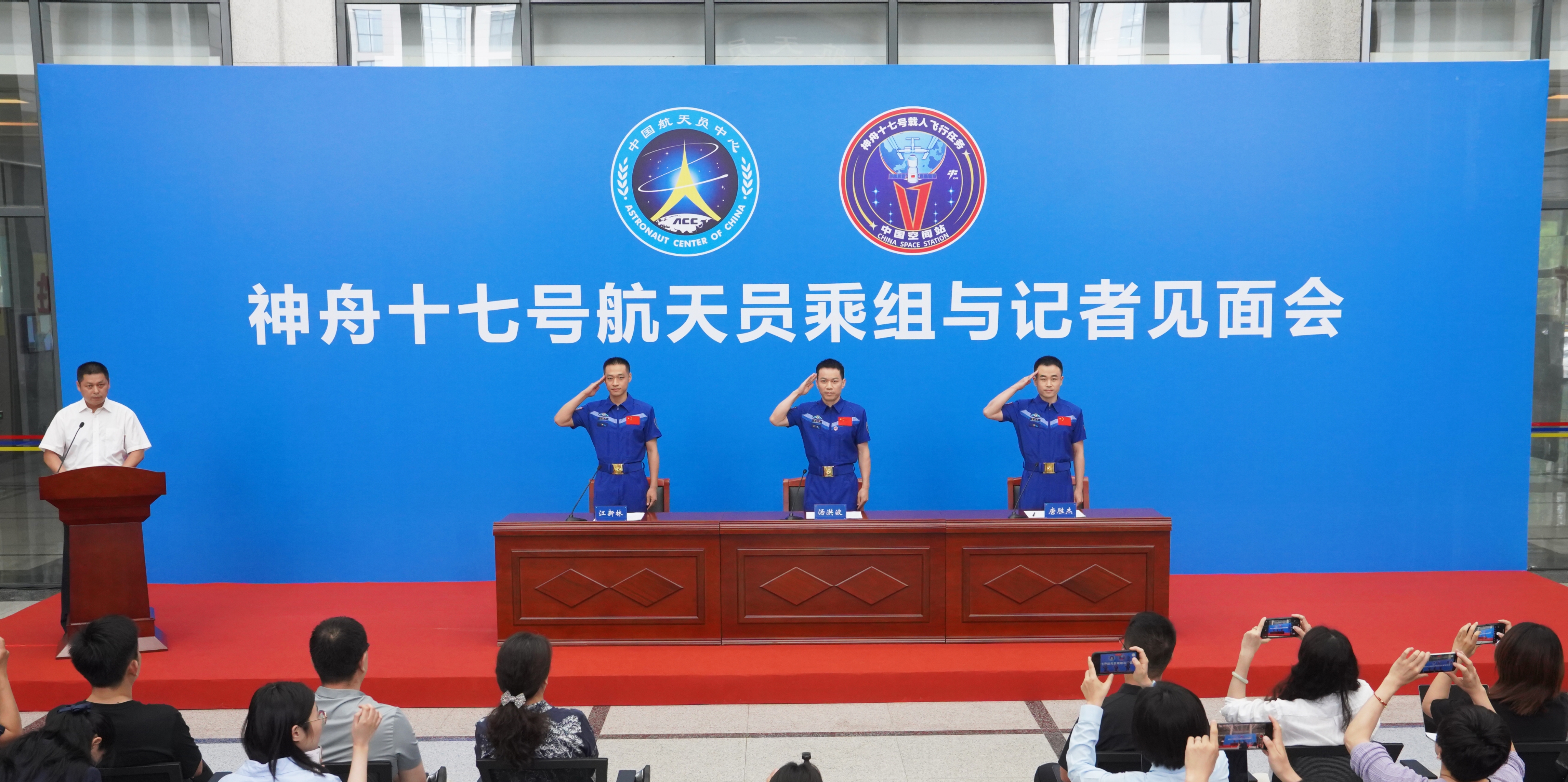 ▲7月5日,在北京航天城,汤洪波(中)、唐胜杰(右)、江新林3名航天员与媒体和公众见面。 新华社发