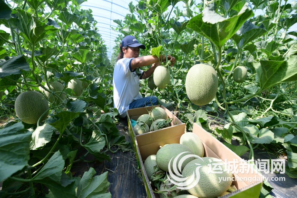 7月4日,瓜农在永济市张营镇小敬村的大棚内采摘哈密瓜。