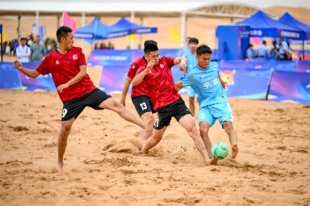 7月6日,宁夏队选手谭嘉诚(右一)在沙漠足球比赛中进攻。
