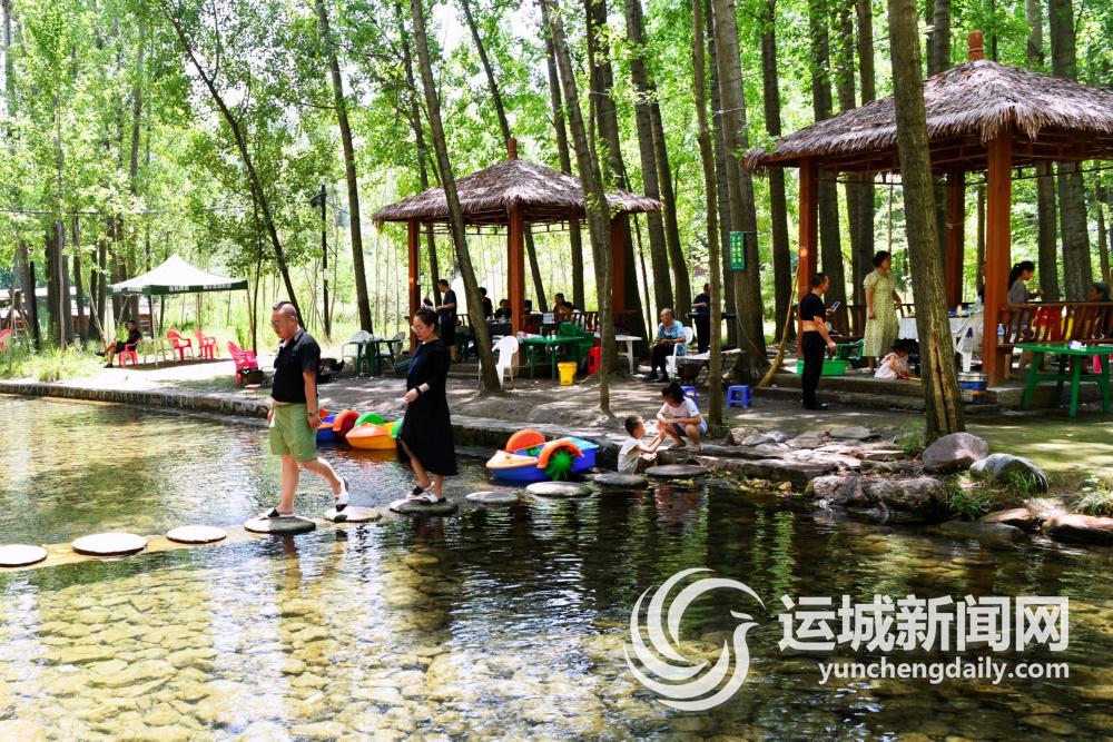 7月7日,游人在垣曲县五龙泉旅游休闲小镇避暑戏水。