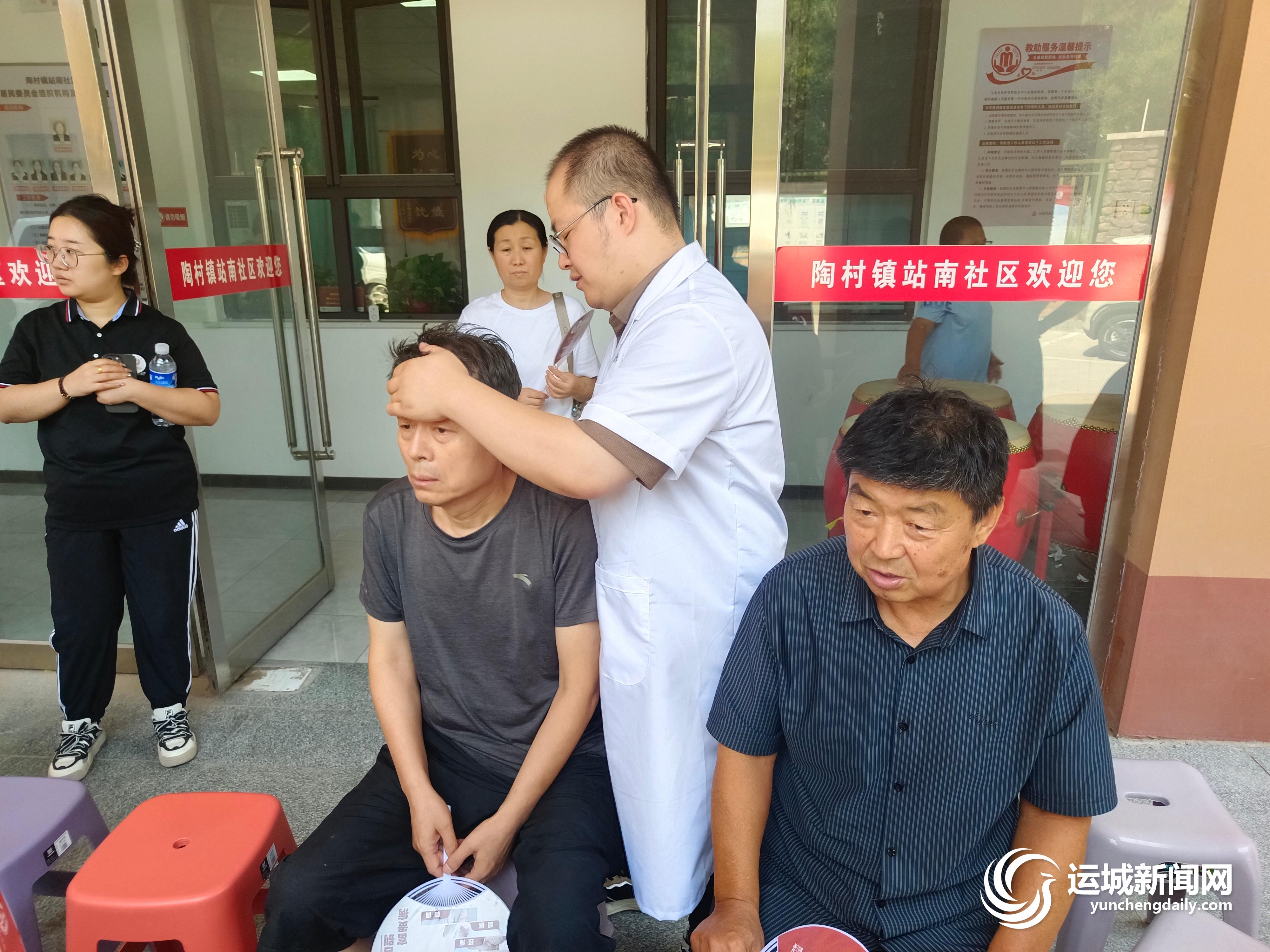 运城晚报讯(记者 李爽)“风池穴位于颈项肌两侧,按摩时,用一只手固定患者头部,用另一只手的拇指、食指点按风池穴……”7月2日上午,在盐湖区陶村镇站南社区党群服务中心内,中医大夫通过示范按摩指法,教居民治疗颈椎病。