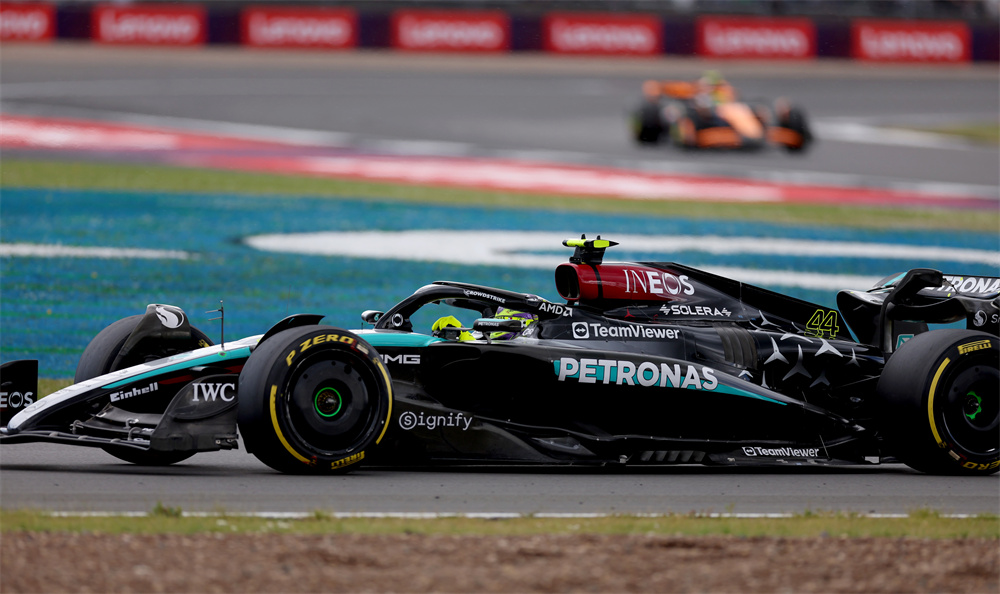 7月7日,汉密尔顿(前)驾驶赛车在比赛中。当日,在英国银石赛道举行的2024赛季世界一级方程式赛车锦标赛(F1)英国大奖赛正赛中,梅赛德斯车队英国车手汉密尔顿夺得冠军。