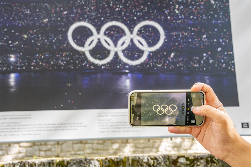 7月6日,参观者用手机拍摄联合国教科文组织展出的北京奥运会开幕式照片。