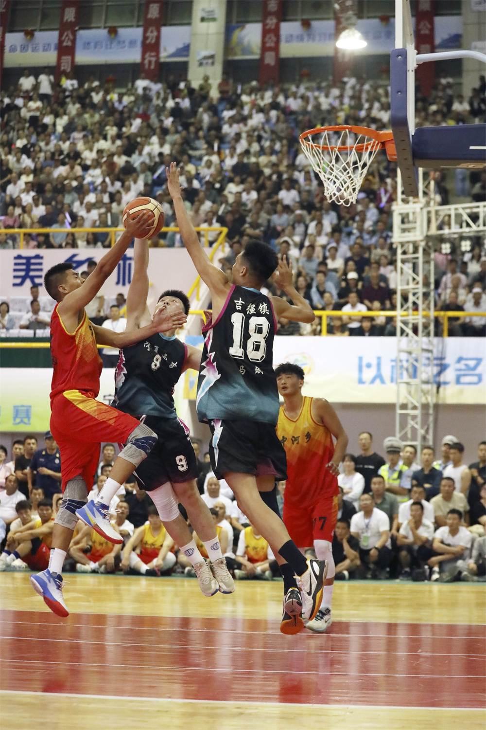 7月6日,西吉县吉强镇队球员马斌(右二)在比赛中封盖对手投篮。