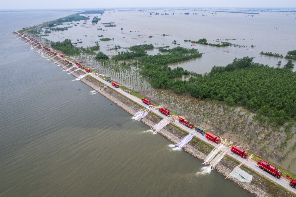 7月9日,湖南省华容县团洲垸团结村附近的洞庭湖大堤上,100多条粗大的水带如同白色长龙横卧堤面。大型排涝设备开足马力,垸内积水源源不断排向洞庭湖。经过前一夜的成功堵口,团洲垸水位开始缓缓下降。