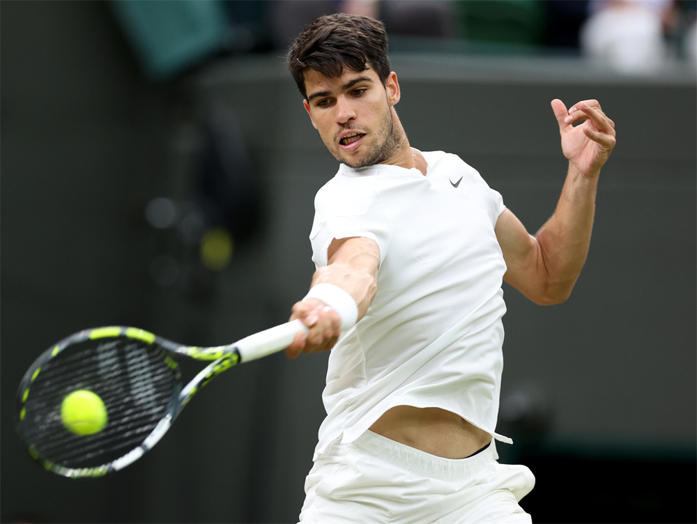 7月9日,阿尔卡拉斯在比赛中回球。当日,在英国伦敦举行的2024温布尔登网球公开赛男单四分之一决赛中,西班牙选手阿尔卡拉斯3比1战胜美国选手汤米·保罗,晋级四强。 新华社记者 李颖 摄