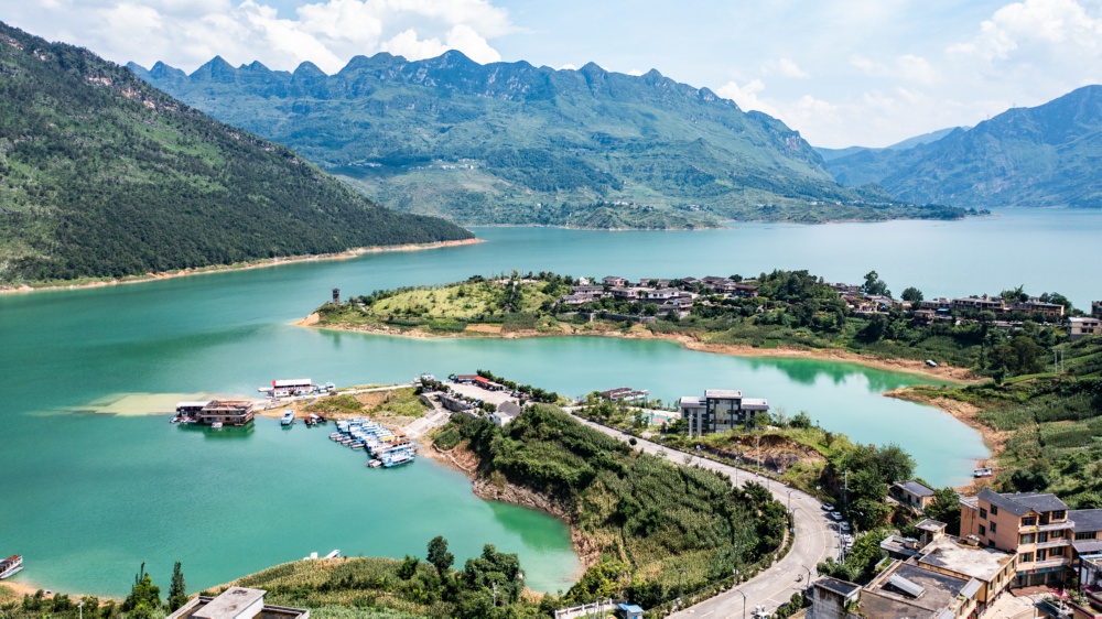夏日时节,贵州省六盘水市六枝特区牂牁江风景名胜区草木植被郁郁葱葱,远山、江水、民居、道路构成一幅幅美丽的画卷。