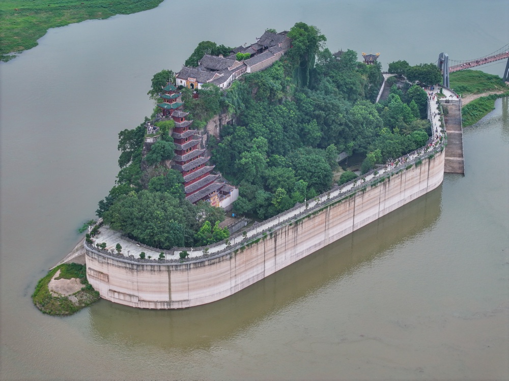 在围堤的环绕保护下,石宝寨仿佛一个有山、有水、有树、有楼的巨型“盆景”,吸引众多游客前来游览。