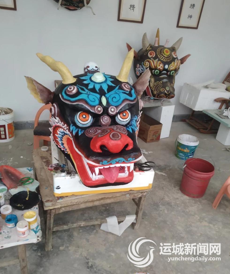今年5月份以来,他们充分发扬工匠精神,制作年兽头,先根据年兽图片,做出骨架模型,用软布麻纸经胶多层裱糊、阴干,取模并修饰,再用油漆上色。每道工序都精益求精,每个环节都精雕细琢。他们以传承非遗的责任担当,不计苦累,现已制作出了两个栩栩如生的年兽头。他们计划再做两个,展现出年兽各种生动表情,然后再做出同样精致的兽身,为阳城高跷走兽增添新鲜血液。
