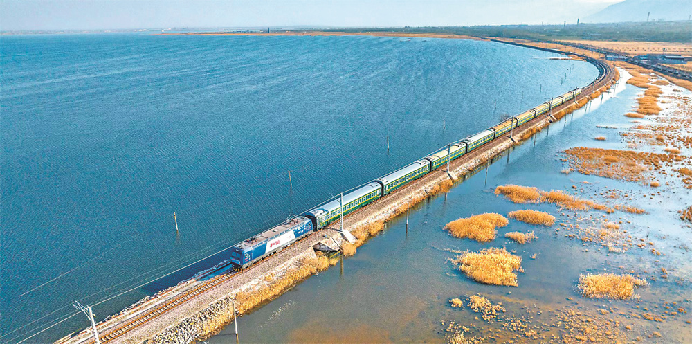 “水上列车”途经盐湖硝池滩(资料图片)。