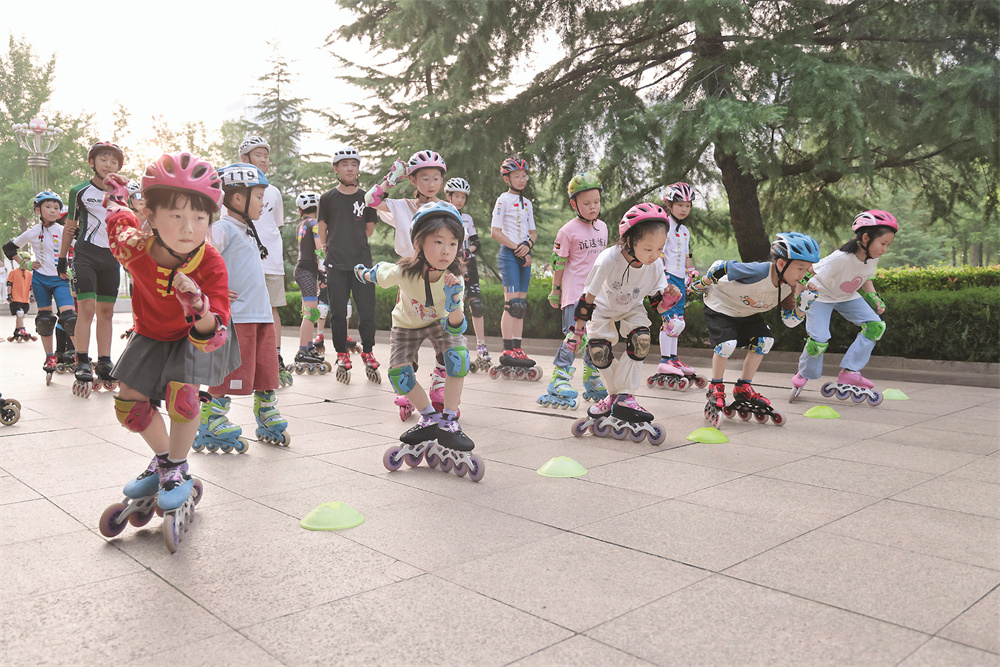7月11日,小朋友在山东省临沂市人民广场练习轮滑。新华社发(许传宝 摄)