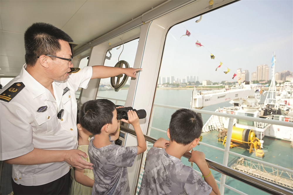 7月11日,在位于山东烟台的交通运输部北海航海保障中心烟台航标处,“海巡153”航标船上的船员为小朋友介绍航海知识。新华社发(唐 克 摄)