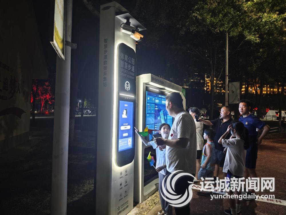 当天傍晚8时许,在市体育公园南门口的“智慧步道”起点处,不少市民在智能数据采集站旁等待注册,或查看自己的运动数据。刘女士带着自己和朋友的孩子在设备前刷脸,看到今日运动里程、时间及排名等出现在屏幕上,几名孩子满脸欣喜。苏女士的儿子受身高限制,够不到智能数据采集站的人脸识别框,看孩子有点着急,她便将孩子抱起来刷脸。