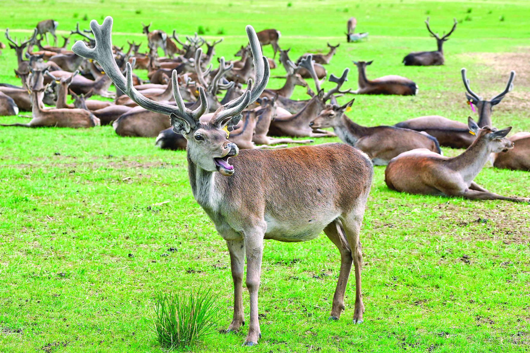 夏日里,在甘肃省张掖市肃南裕固族自治县的神鹿公园,600多头马鹿在草原上休憩觅食,游客可以近距离观看马鹿并与其互动。