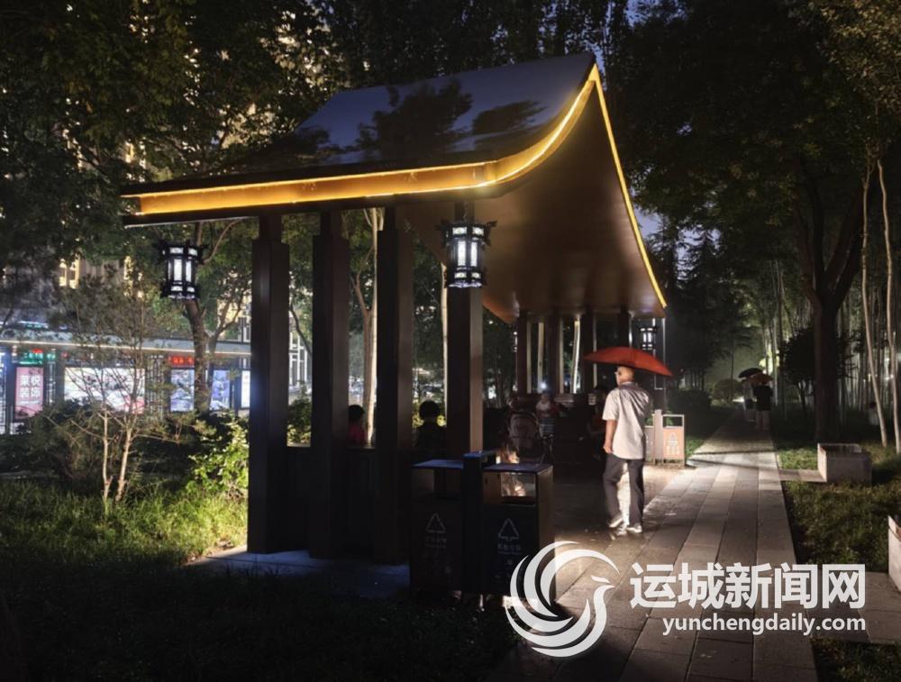 无论在什么天气,走进“口袋公园”,都能满足自身的多样需求。天晴时,“口袋公园”里的小亭子可以为人们遮阳;下雨时,小亭子便成了避雨的好地方。天刚擦黑时,雨下大了。市民李先生刚好路过一个“口袋公园”,便走进去避雨。此时亭子下面已经坐满了人,大家你一言我一语地聊着天,好不热闹。站在远处望去,亭子及坐凳周围的氛围灯已经亮起,为这雨夜增添了一抹亮色和温暖。