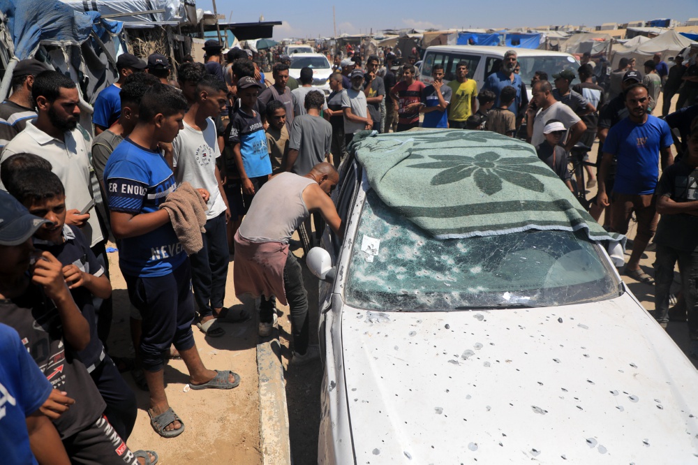 7月16日,在加沙地带南部汗尤尼斯的马瓦西地区,人们查看被以军袭击的车辆。巴勒斯坦伊斯兰抵抗运动(哈马斯)媒体办公室16日发表声明说,以空军当天空袭了加沙地带南部汗尤尼斯的马瓦西地区,造成至少17人死亡、26人受伤。