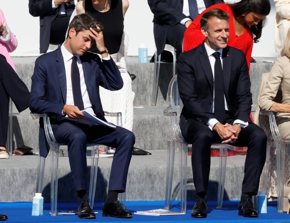 在法国巴黎凯旋门附近,法国总统马克龙(右)和总理阿塔尔出席国庆节阅兵式(7月14日摄)。据法国媒体援引总统府消息,总统马克龙16日批准总理阿塔尔的辞职请求。