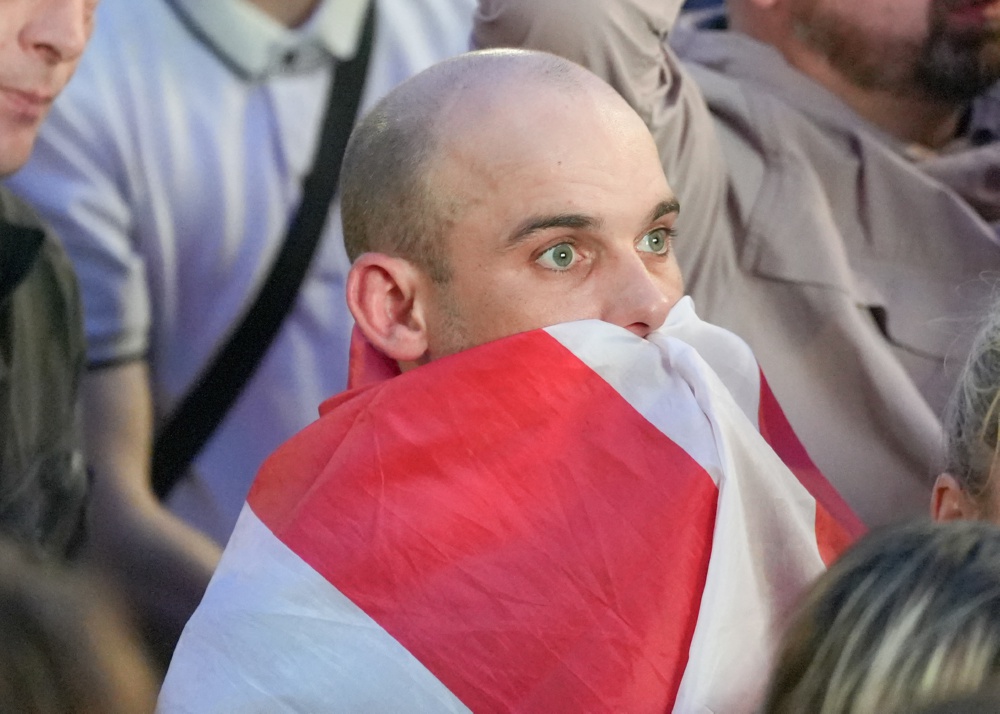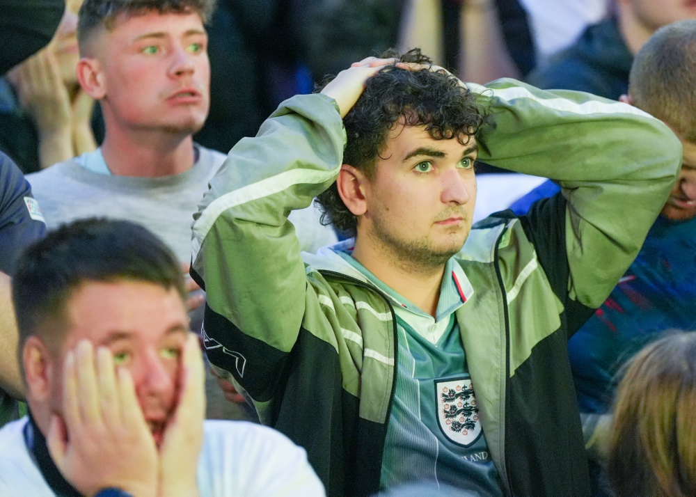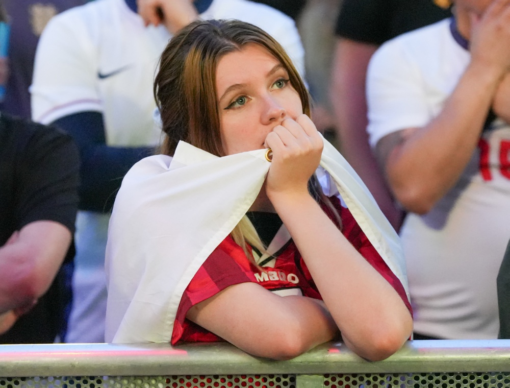 7月14日,在英国利兹的英格兰队球迷观看比赛直播时表情失落。