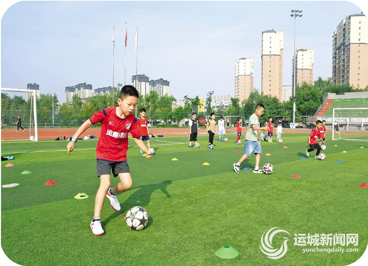 7月15日,学生在闻喜县体育中心进行足球训练。暑假期间,闻喜县组织学生参加形式多样的主题特色活动,丰富暑假体验,拓展兴趣爱好,让孩子们乐享假期快乐时光。特约摄影 温徐旺 摄