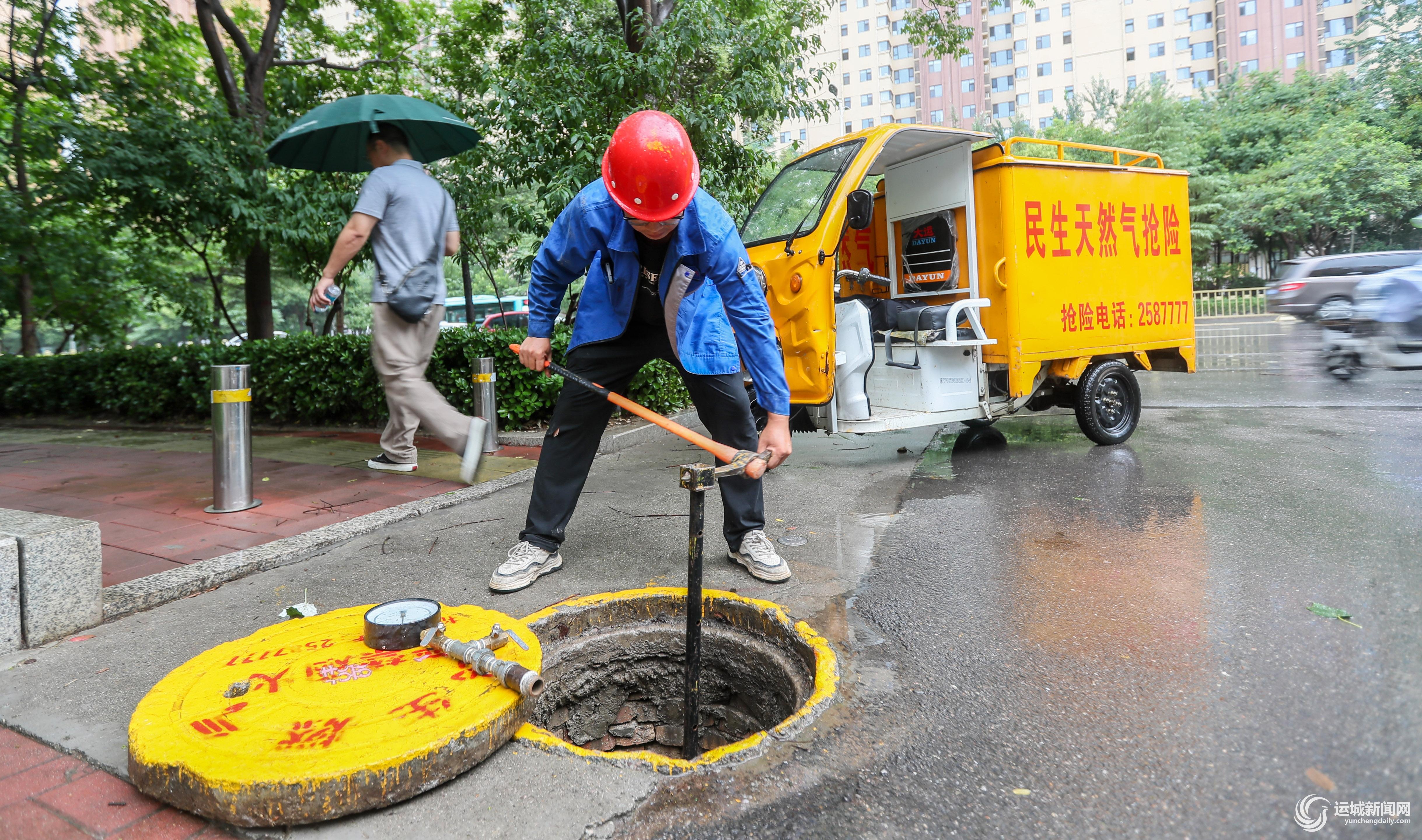 山西民生天然气有限公司工作人员在河东东街明瑞园小区门口检修天然气管道。本报记者 金玉敏 摄