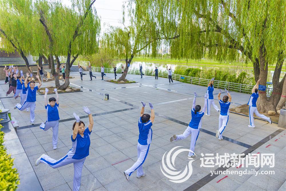 7月21日,盐湖区黄金水岸小区居民翩翩起舞,享受晨光。