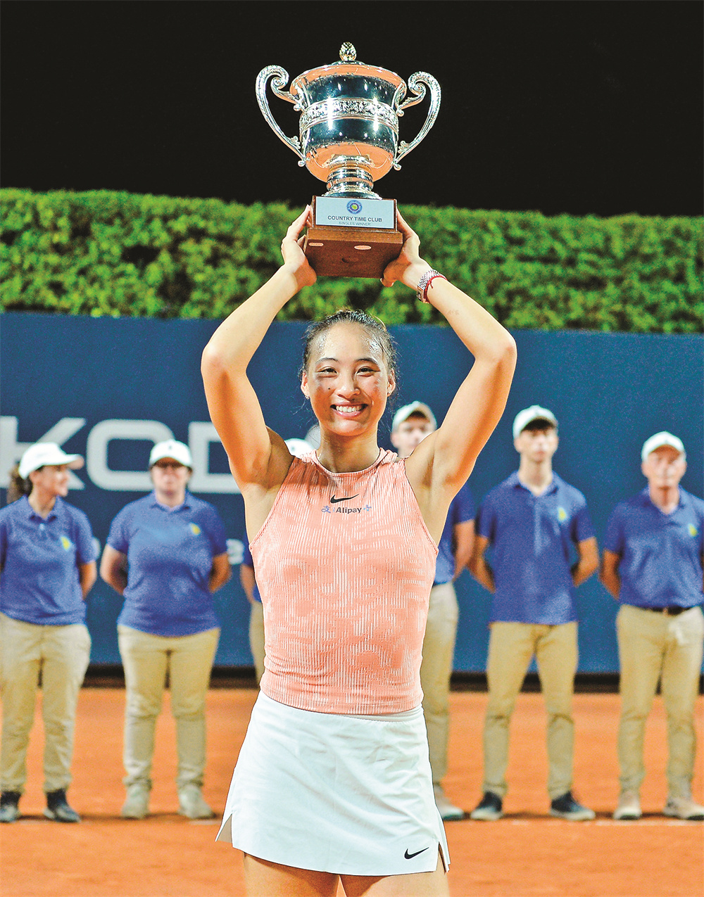 7月21日,郑钦文在颁奖仪式上高举冠军奖杯庆祝。