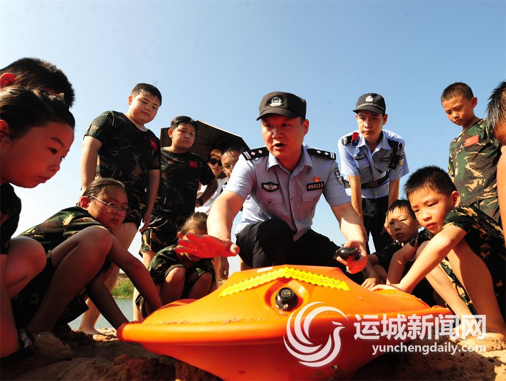 7月21日,万荣县公安局裴庄派出所民警在汾河岸边向青少年讲解演示新型智能救生艇的使用方法。