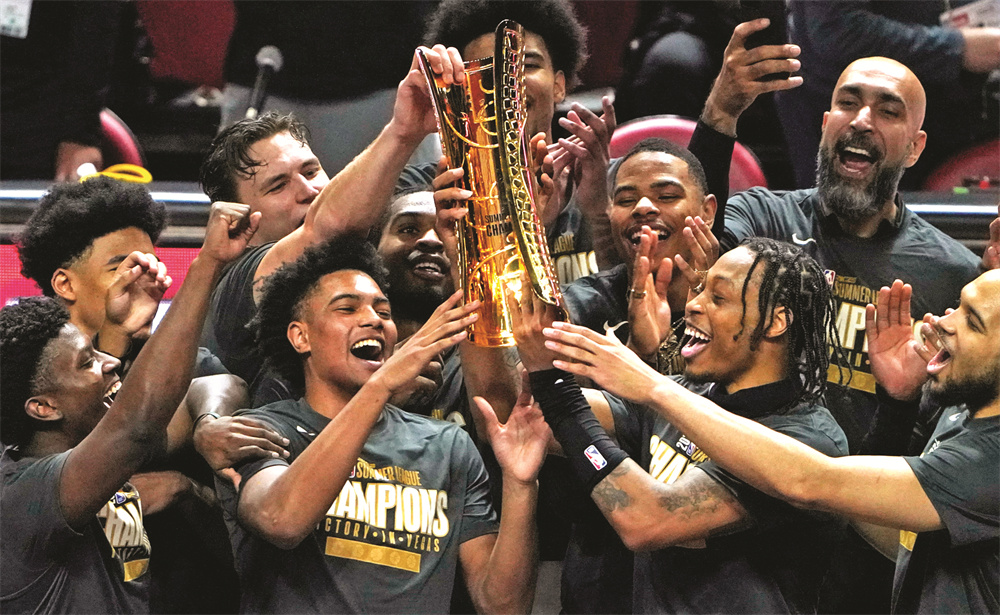 7月22日,热火队球员在颁奖仪式上与奖杯庆祝。当日,在NBA夏季联赛决赛中,迈阿密热火队120比118战胜孟菲斯灰熊队,夺得冠军。 新华社记者 吴晓凌 摄